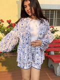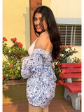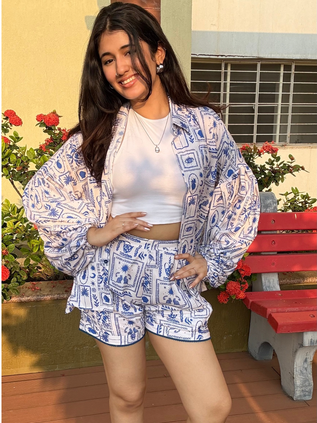Say hello to art-inspired elegance with the Brushstroke Breeze Co-ord – a summer essential that blends comfort with creativity. Featuring painterly blue motifs on a soft white base, this 100% cotton set includes a breezy button-down shirt and tailored high-waist shorts. Lightweight, breathable, and effortlessly cool, it’s your go-to ensemble for vacation strolls, beach cafés, and sunny brunch scene