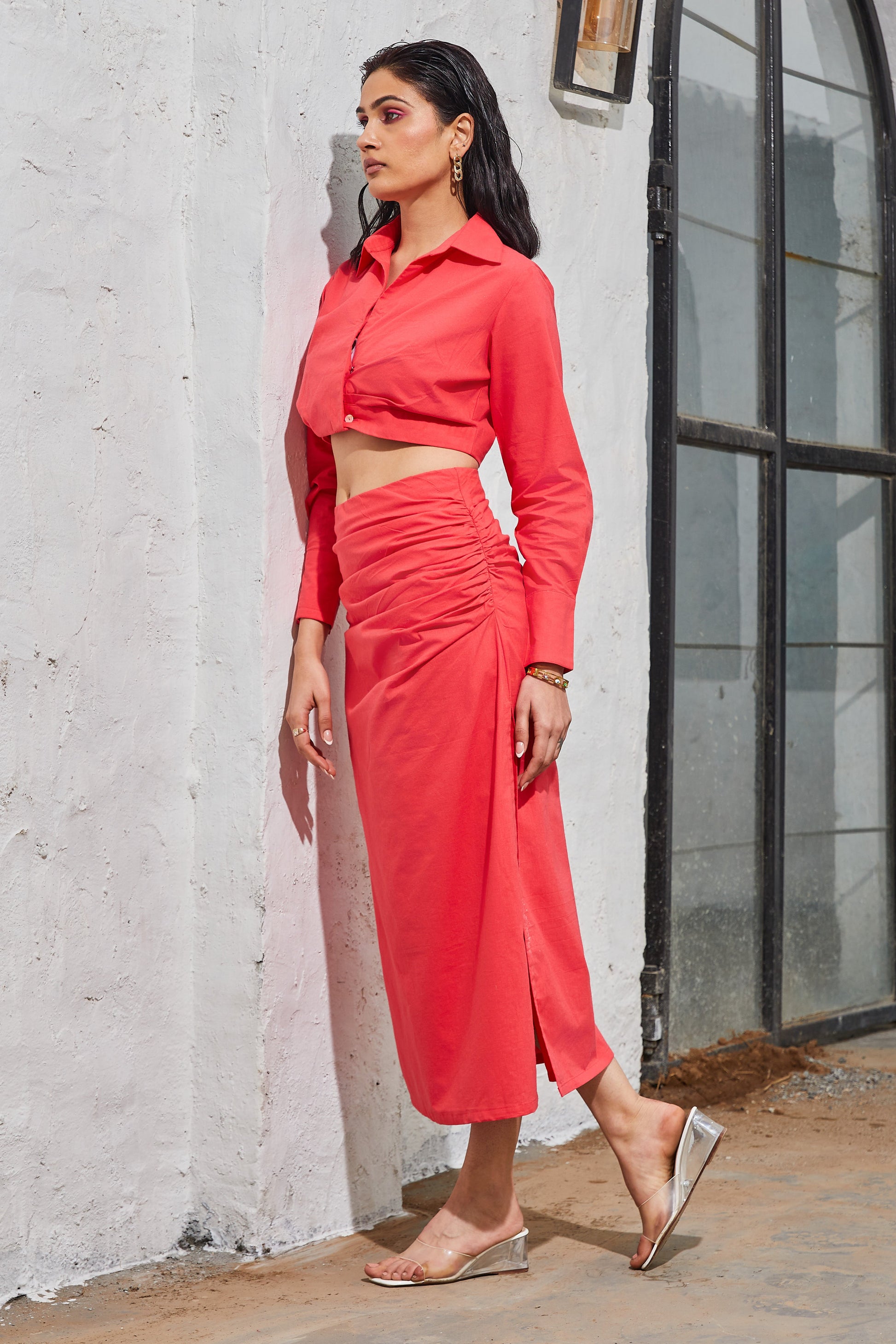 Transition seamlessly from daybreak to dusk with the Daybreak to Dusk Skirt Set, an impeccable attire choice designed to elevate your office wardrobe. Crafted from premium poplin fabric, this set boasts a flawless silhouette that exudes glamour and confidence in the workplace. Available in sophisticated sand white and charming peach pink, the Daybreak to Dusk Skirt Set offers the perfect combination of style and professionalism, ideal for achieving a chic summer office look.