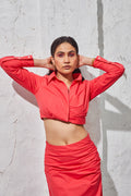 •Crop top features a collar and cuffed sleeves, offering a perfect formal attire option.
