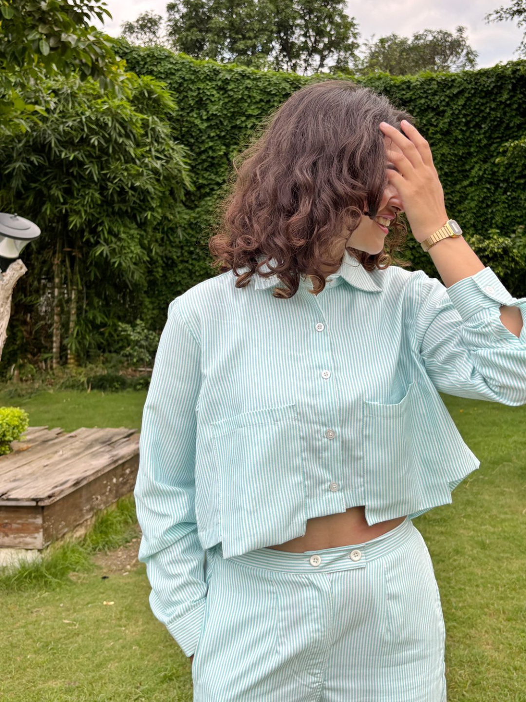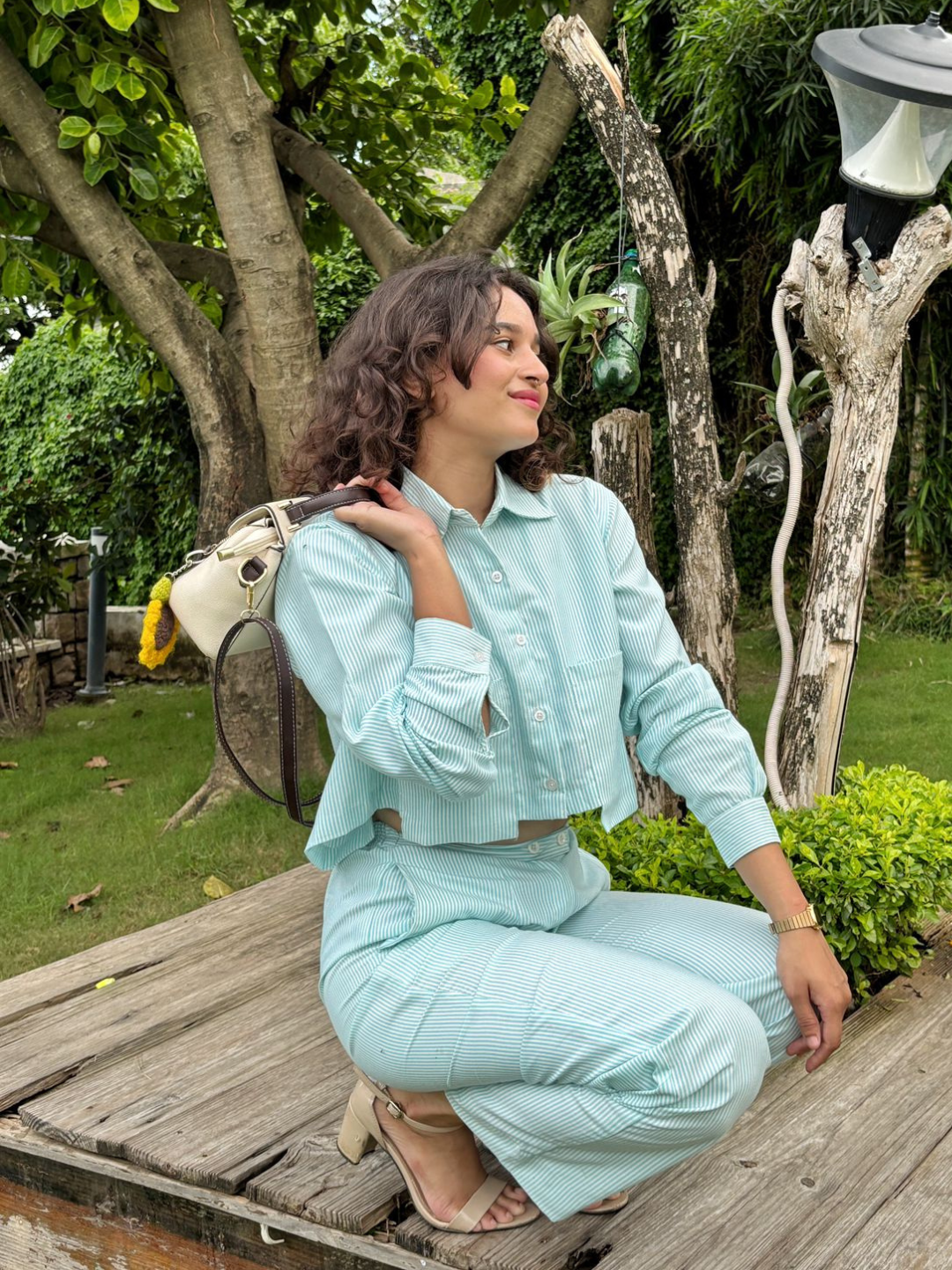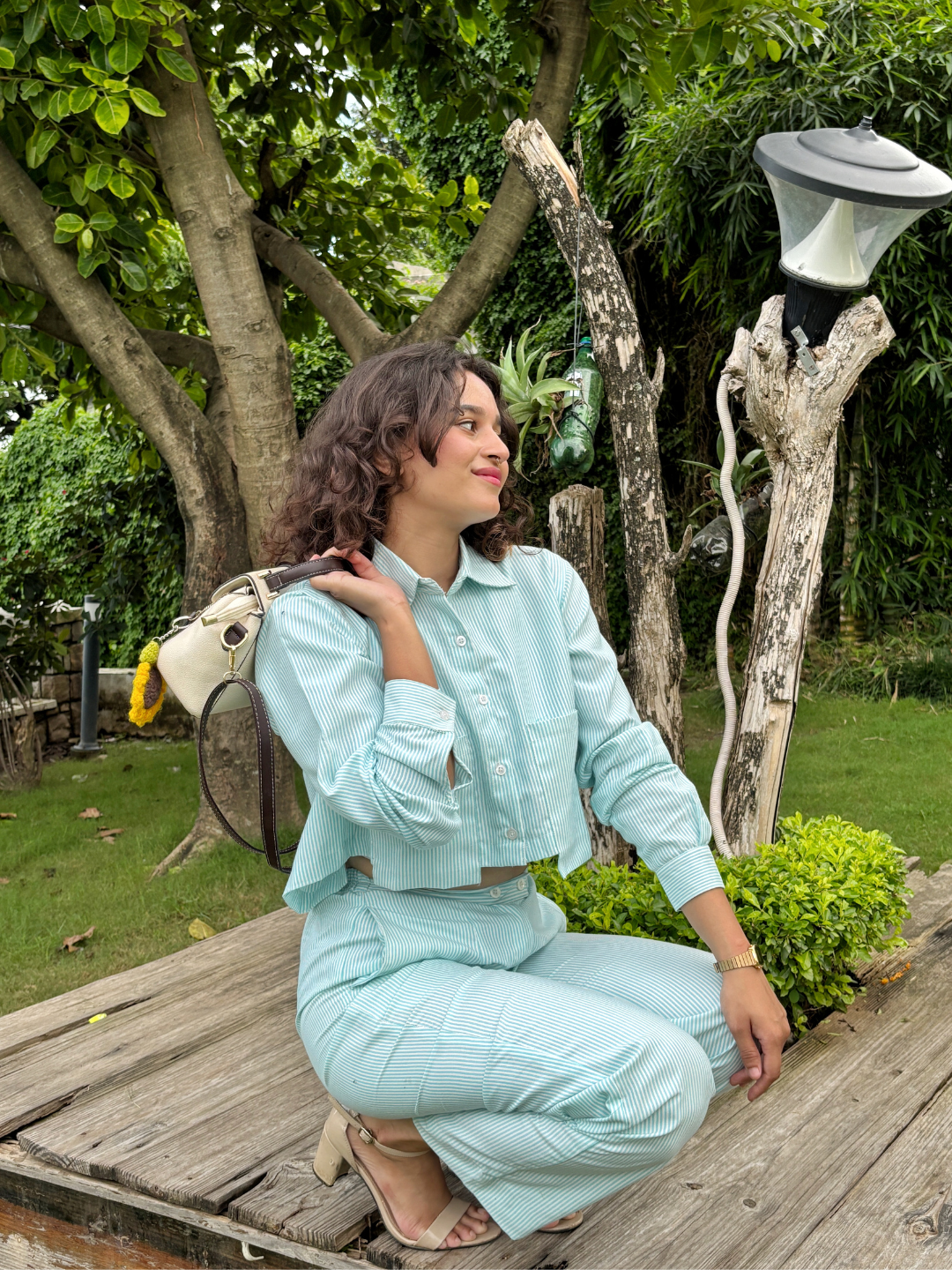 Elevate your wardrobe with the Greenlight Getaway Co-ord Set — a versatile two-piece made from 100% cotton that blends comfort with statement style. In a refreshing green and white palette, this set includes a cropped shirt and matching pants, perfect for everything from workdays to weekend escapes.