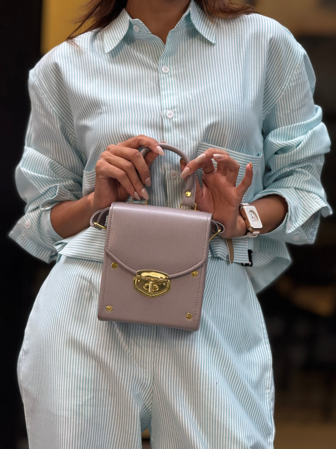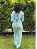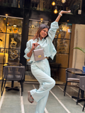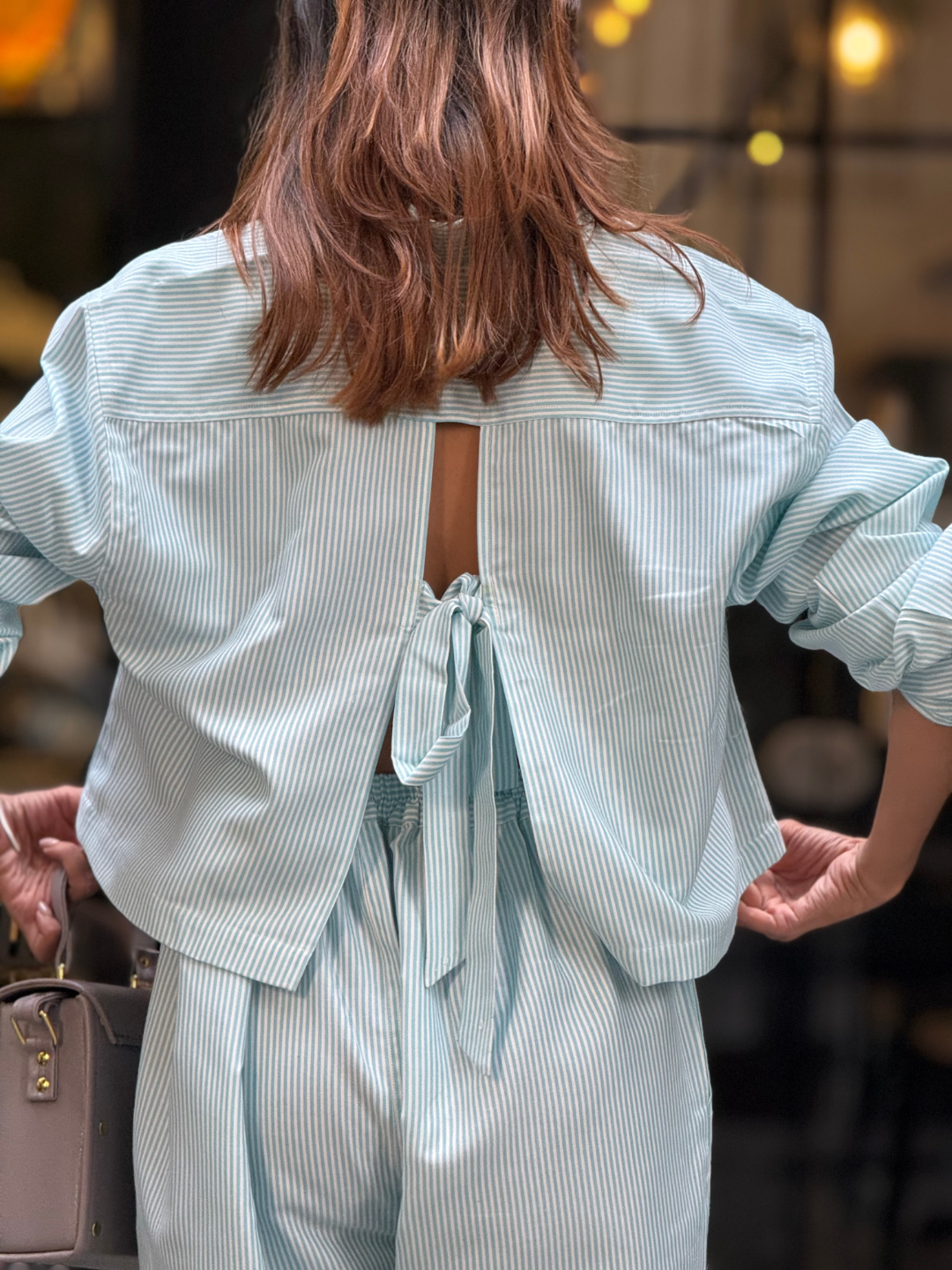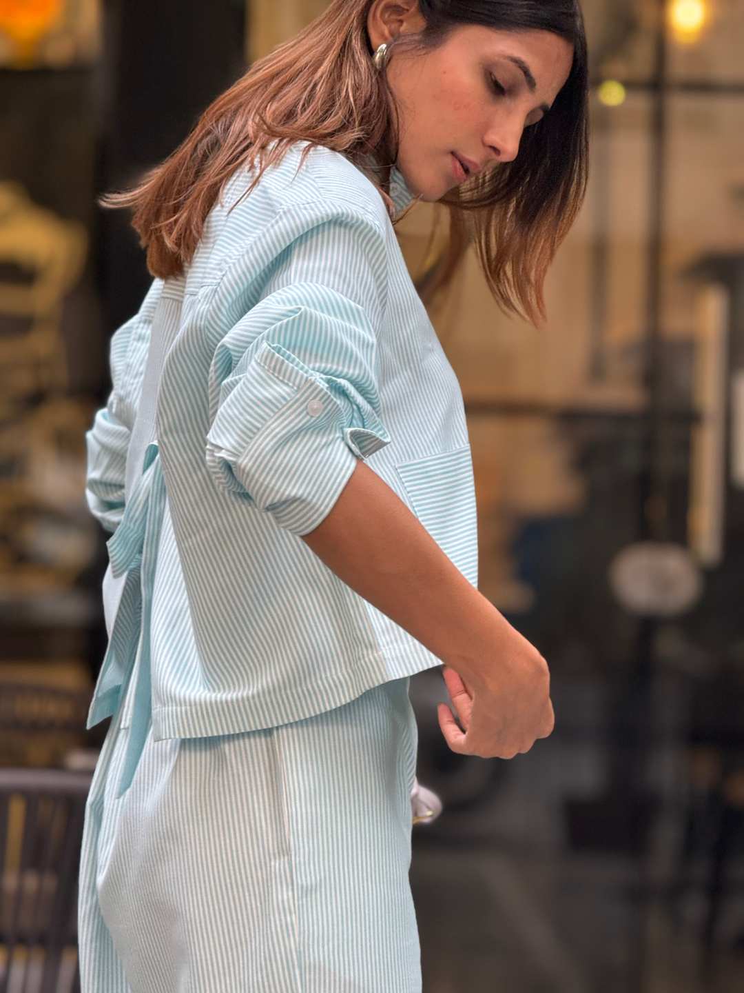 The crop shirt steals the spotlight with oversized pockets and a bold, tieable bow at the back – an unexpected twist that instantly turns heads. It’s chic, structured, and summer-friendly all at once. The pants are high-waisted with button detailing and roomy pockets – designed to move with you while keeping it polished.